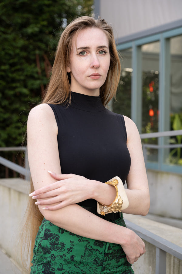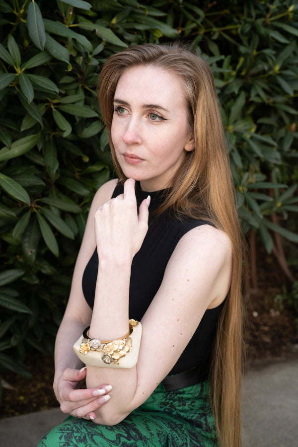 The Floral Chunky Wood Bangle is the final statement piece in any fashion puzzle. Meticulously handcrafted and one-of-a-kind, this square-shaped wood bangle features an ivory finish and is adorned with radiant gold and silver flowers and leaves — a symbol of blossoming beauty. The beautifully sculpted winding stems add depth and sophistication to the design.