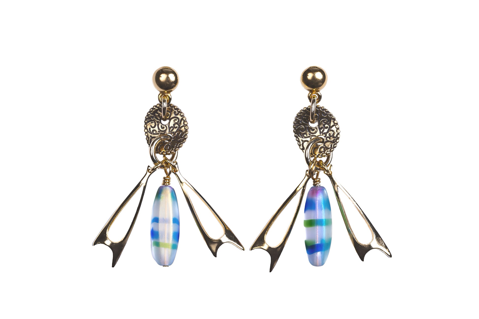 The Flwr Chyld Earrings are a stunning fusion of vintage charm and modern flair. These handcrafted earrings feature textured abstract gold coins paired with bezel-cut frosted fiesta glass dangles, creating a captivating silhouette that catches the light with every movement. The intricate gold coins and wing-like metal accents add depth and elegance, while the vibrant blue and green striped glass beads bring a playful pop of color.