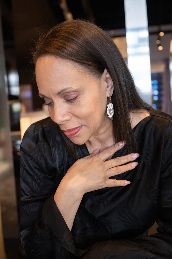 The Mask Earrings are a striking blend of artistry and elegance, designed to elevate any ensemble with effortless sophistication. Handcrafted from glazed ceramic clay and finished with gold-plated accents, each pair offers a unique sculptural quality that feels both modern and timeless. The black and gold-toned mixed metal ear wires add a sleek contrast, while the elongated silhouette—measuring approximately 2.5 to 3 inches—creates a bold yet refined statement. Whether paired with everyday essentials or styled for a night out, these earrings are the perfect finishing touch for the fashion-forward individual.