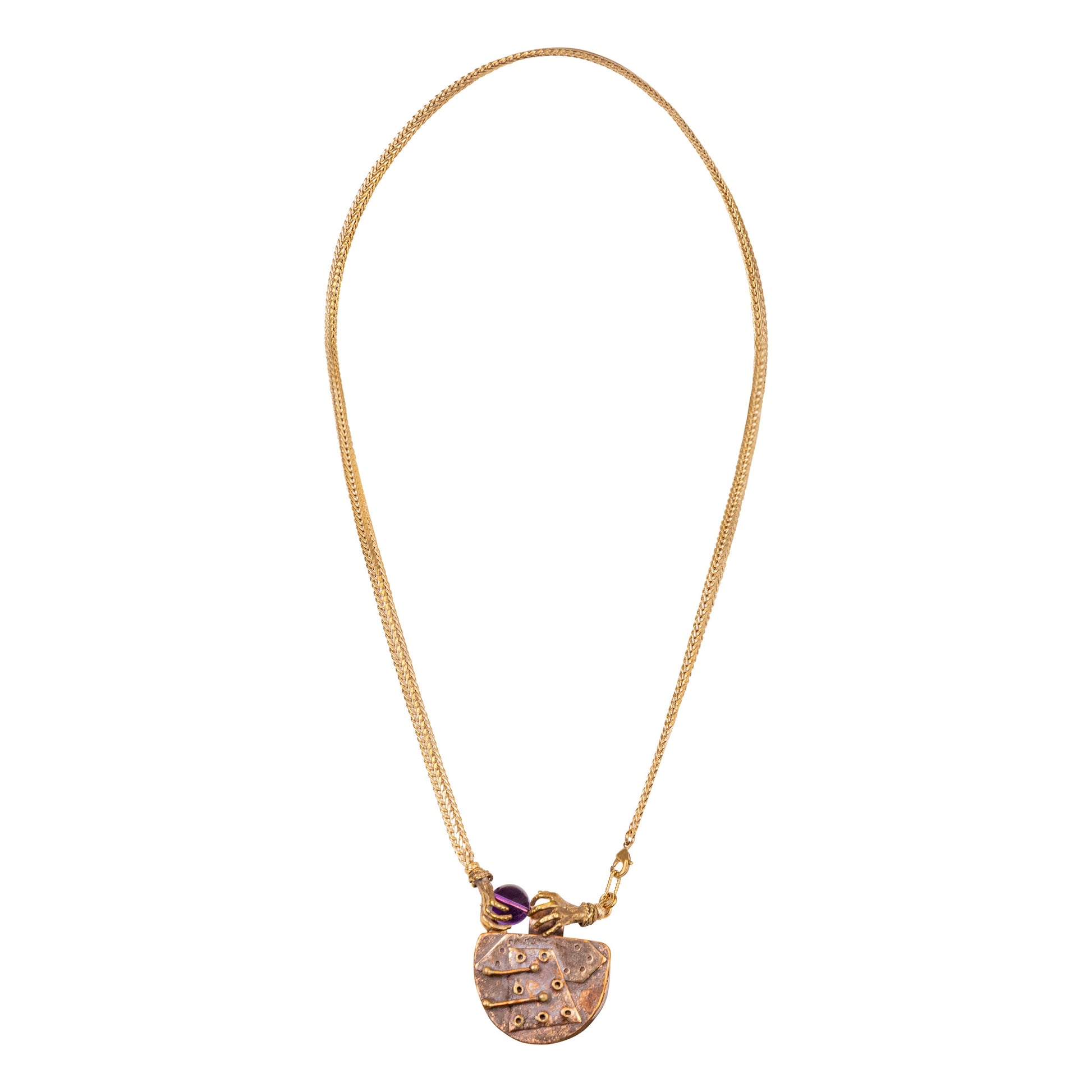 The Nebulon Necklace combines modern artistry with timeless appeal. Crafted from copper and gold-plated brass, it features a delicate chain and a half-circle pendant adorned with intricate detailing. A genuine amethyst accent adds a subtle pop of color and a touch of luxury, making this piece perfect for layering or wearing solo. Designed for versatility, it transitions effortlessly from day to night, complementing both casual and sophisticated looks.