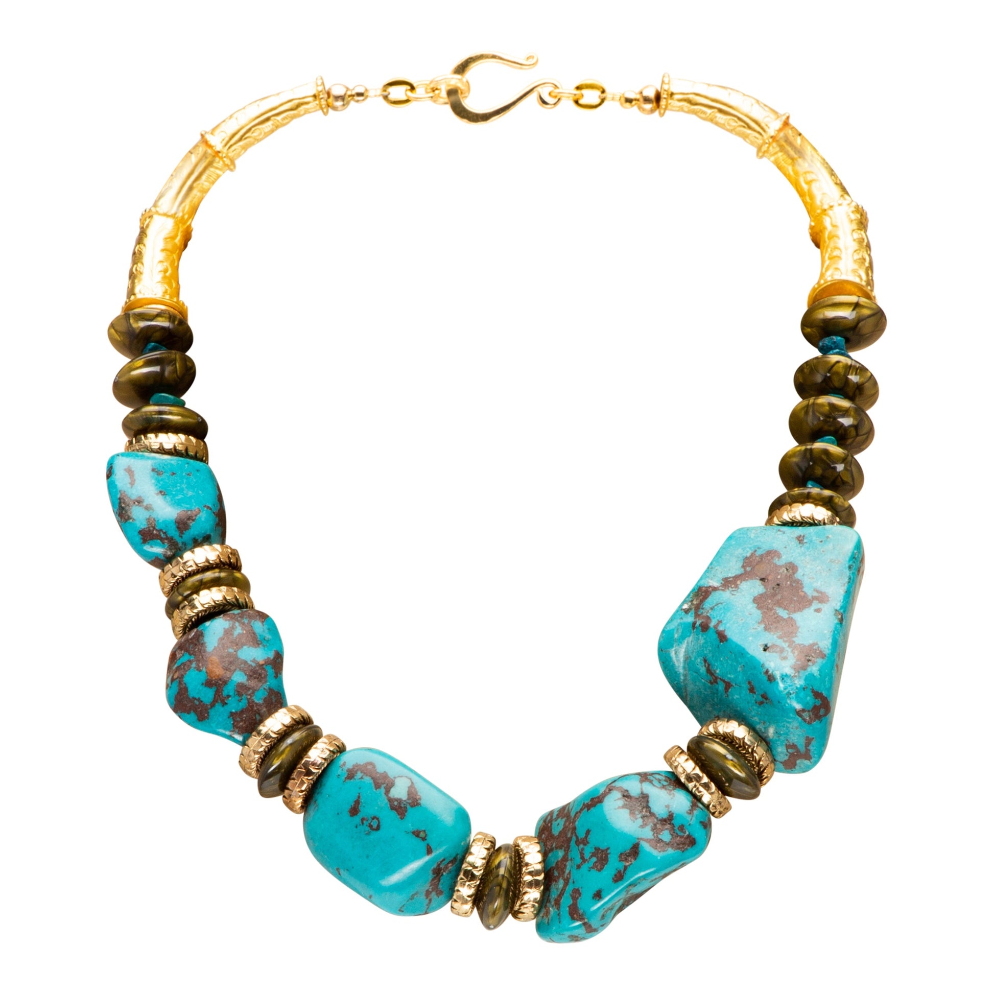 Discover the perfect balance of bold design and timeless elegance with the Seven & 7 Necklace. This statement piece features Blue Howlite stones, celebrated for their soothing sky-blue tones and natural marbling, paired with vintage Lucite beads that add a touch of retro sophistication. Gold-plated accents and a polished clasp complete the look, creating a harmonious blend of color and texture that feels both modern and classic.