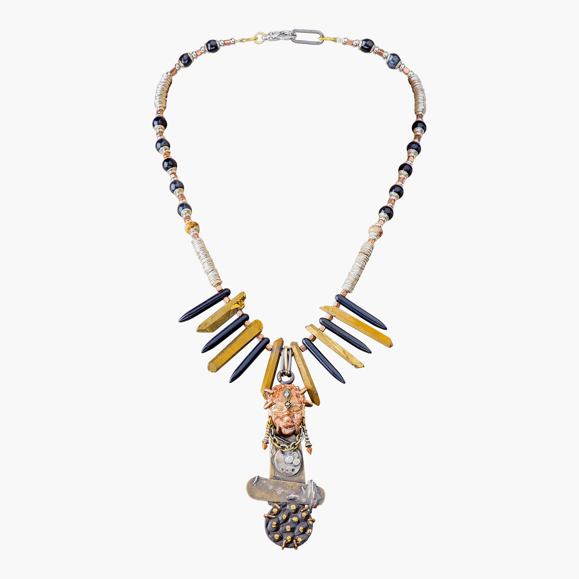 Discover a statement piece that embodies artistry and elegance. The Awakened Soul Necklace is meticulously handcrafted using magnesite and ceramic beads, accented with luxurious gold details for a sophisticated finish. Its design features a striking copper face pendant that reflects timeless craftsmanship and individuality.